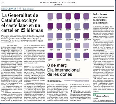 Efectivamente, para la celebración del Día Internacional de la Mujer, la Generalitat publica un cartel en 25 idiomas en los que se echa en falta el español y el inglés. Curioso. ¿Olvido?. ¿Desprecio?. No lo sé, tal vez sean los idiomas que el Sr. Montilla ignora, lo que tampoco es de extrañar a la vista de su acervo cultural