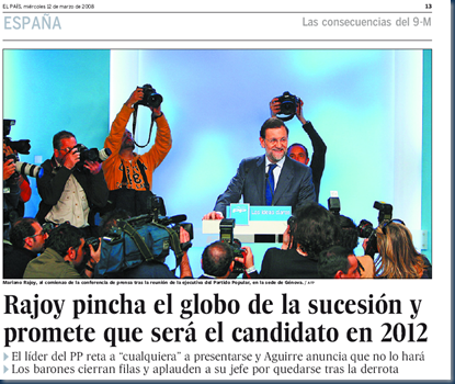 Por una parte me parece acertada la decisión de D. Mariano. Por otra, no alcanzo a comprender bien el sentido de la noticia: ¿Qué significa pincha?. Toda vez que puede interpretarse como un "fracaso" (pinchazo), debería haberse obviado este término en la cabecera de la noticia. Más abajo señala que "pierde" las elecciones. Aún más difícil de entender. ¿No sería más correcto decir que las ha ganado el PSOE?. Veamos: El aumento porcentual en escaños fue mayor para el PP que para el PSOE, lo mismo que el incremento en número de votos; resulta evidente que el PP no ha ganado las elecciones, pero también es cierto que ha crecido, ha consolidado aún más si cabe su suelo electoral y se afianza como la única opción política alternativa al gobierno actual. Los calificativos innecesarios son escritos con una aviesa intención, o con miedo, que es peor.