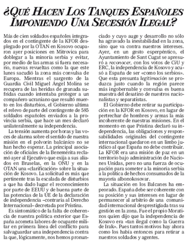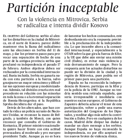 Llamativa -y curiosa- coincidencia en la línea de las dos editoriales de EL MUNDO y EL PAIS en el día de hoy. Incluso el diario del gobierno señala la conveniencia de una nueva consulta al Congreso para sostener en los Balcanes la secesión de una zona que nuestra propia diplomacia ha considerado ilegal. Los vericuetos de la política internacional tienen estas servidumbres: El Sr. Aznar se alineó (indebidamente desde mi punto de vista) con Bush y Blair para invadir Irak y el Sr. Zapatero retiró las tropas media hora antes del espaldarazo de la ONU a la misión. Nuestros soldados no pegaron un solo tiro en esa "guerra ilegal", mientras ayer mismo resultaba herido un sargento de la Guardia Civil intentando proteger a un policía de la ONU que resultó muerto. Así pues, todos los gobiernos sufren miserias y nuestro deber es mostrar apoyo a la actuación española fuera de nuestras fronteras, al margen de cualquier crítica o comentario que hagamos de puertas hacia dentro.